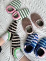 The Sailor Slippers are worked flat in stockinette stitch starting with the heel panel. Stitches are then picked up at the right side of the heel panel, cast on in extension and picked up at the left side of the heel panel. This forms the top of the slippers, which is knit from ankle to toe. From there, you will carry on knitting the sole from toe to heel. The top of the foot and sole are seamed together using mattress stitch, and the heel panel and sole are then seamed horizontally. The applied i-cord is then added to form the slipper opening, before washing and felting.